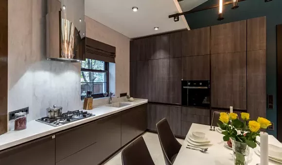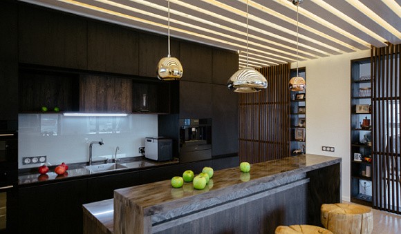 Современный дизайн темных кухонь универсален. В нем превалирует сдержанность и строгость, что характеризует благородные интерьеры. Если в таком помещении правильно расположить темную мебель, то кухня зрительно сузится, а потолок станет ниже.