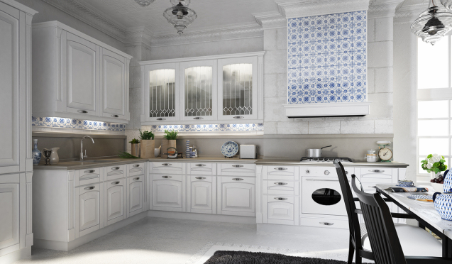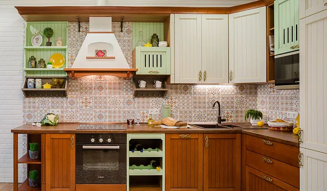 • Более авангардные решения, в которых на фасадах мебельного гарнитура применяются вставки из натурального дерева или белые блоки – смотрятся более свежо в любой обстановке вне зависимости от степени освещенности. Они понравятся почитателям стилей прованс, эклектика и модерн.