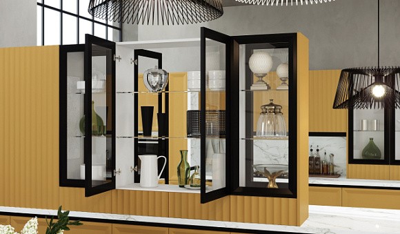 Кухонную мебель желто-черного цвета используют при оформлении больших площадей. Такая расцветка подчеркивает геометрию модулей, усиливает вертикальные и горизонтальные линии. Обычно ее выбирают для интеграции в современные интерьеры.