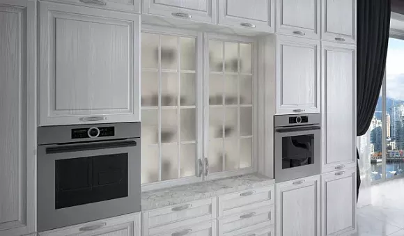 Кухня с золотом сама по себе выглядит нарядно и гармонично, поэтому избыток декора может ее удешевить визуально. Как правило, для оформления подобных комплектов используются стеклянные вставки, контрастные элементы, рельефные узоры.