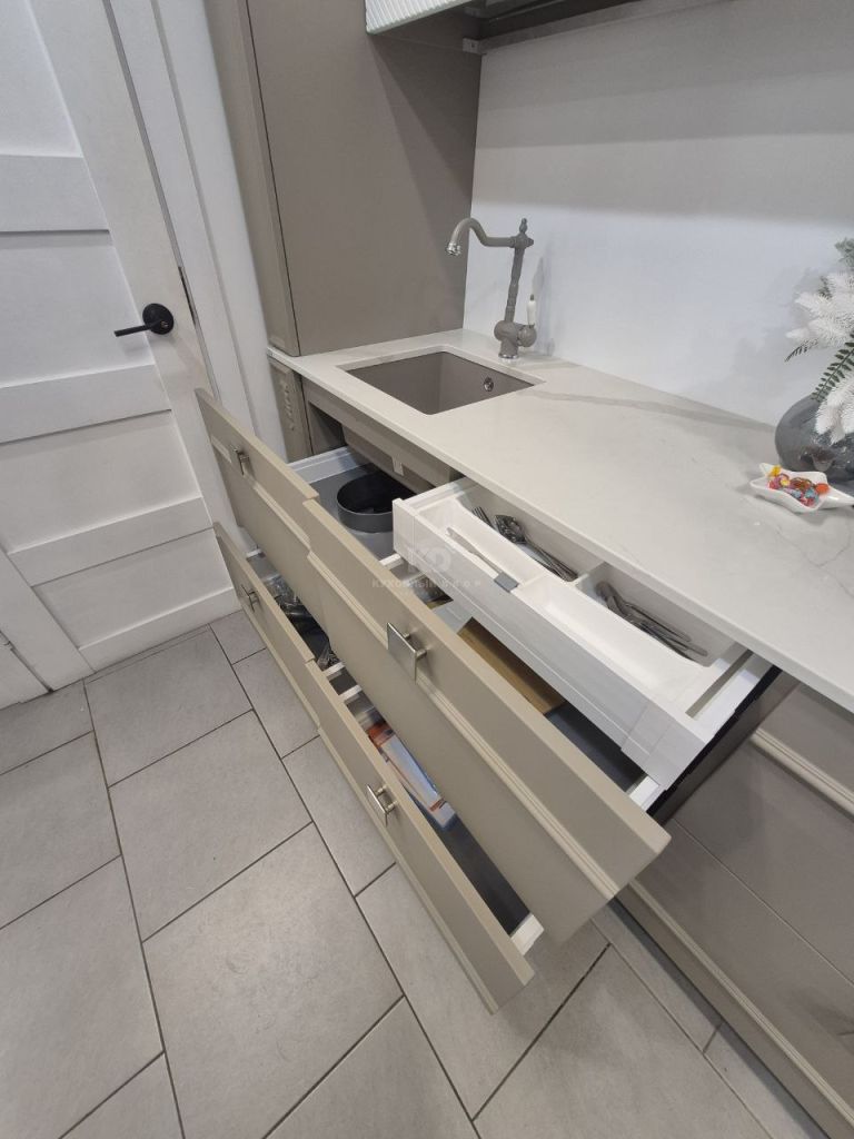 В стоимость образца включена: мебель (корпус Egger, фурнитура Hettich), столешница, мойка подстольного монтажа, смеситель.